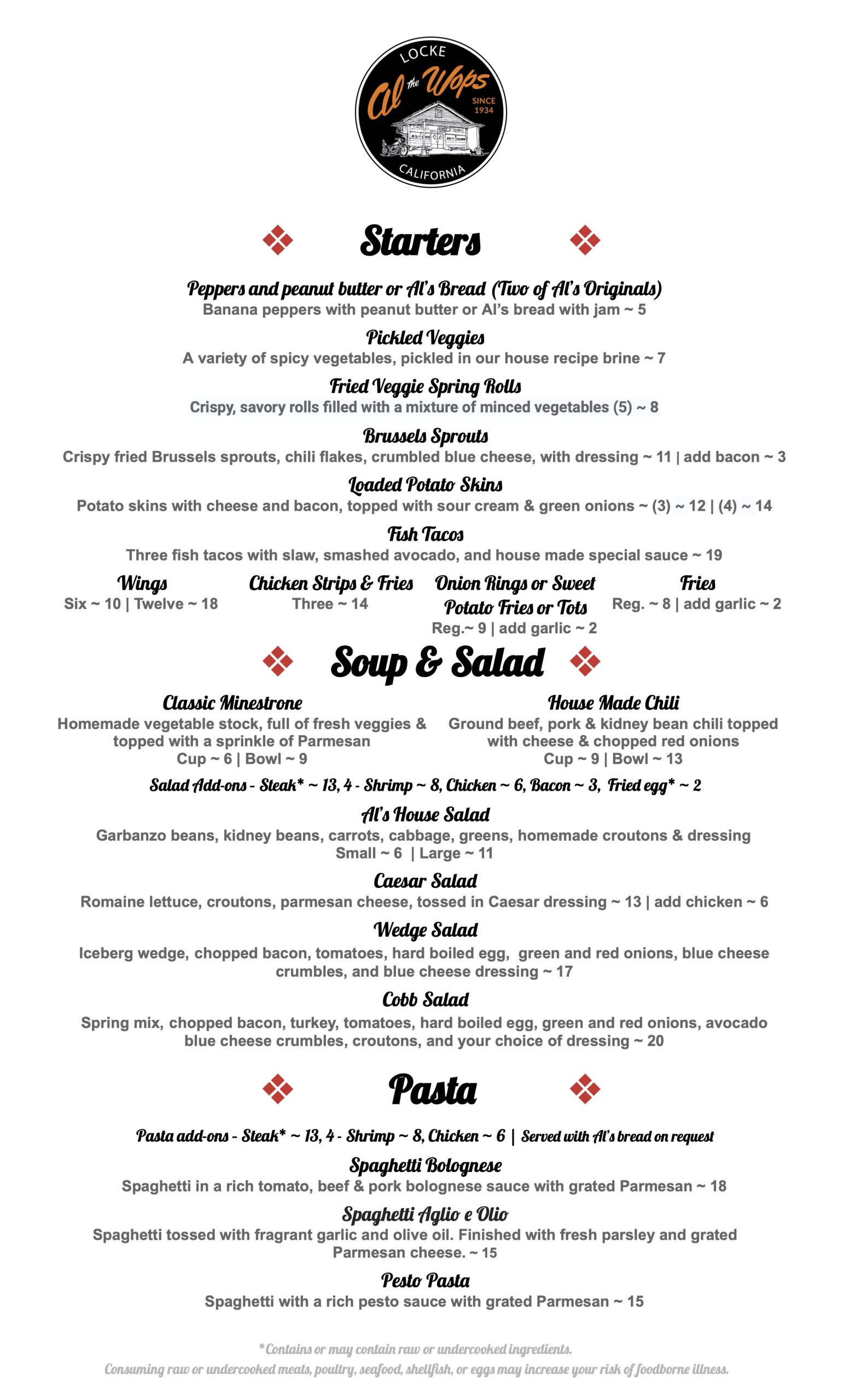 Many of those traditions are still alive and well at Al’s, the dollars are still on the ceiling, you are expected to take your tie off before you come in, and you definitely want to leave your worries outside. In its almost 100 year history Al the Wop’s has become a destination for bikers, boaters and tourists from around the world. We pride ourselves on holding on to the values that Al established. It’s a place to leave your worries at the door, enjoy good drink and food, and experience the community of the California Delta with your friends.