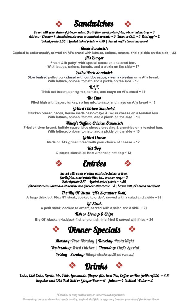 Al’s kitchen is open: Monday 11-4 pm | Sunday, Tuesday, Wednesday, and Thursday: 11 AM to 7 PM* | Friday ~ Saturday: 11 AM to 8 PM*